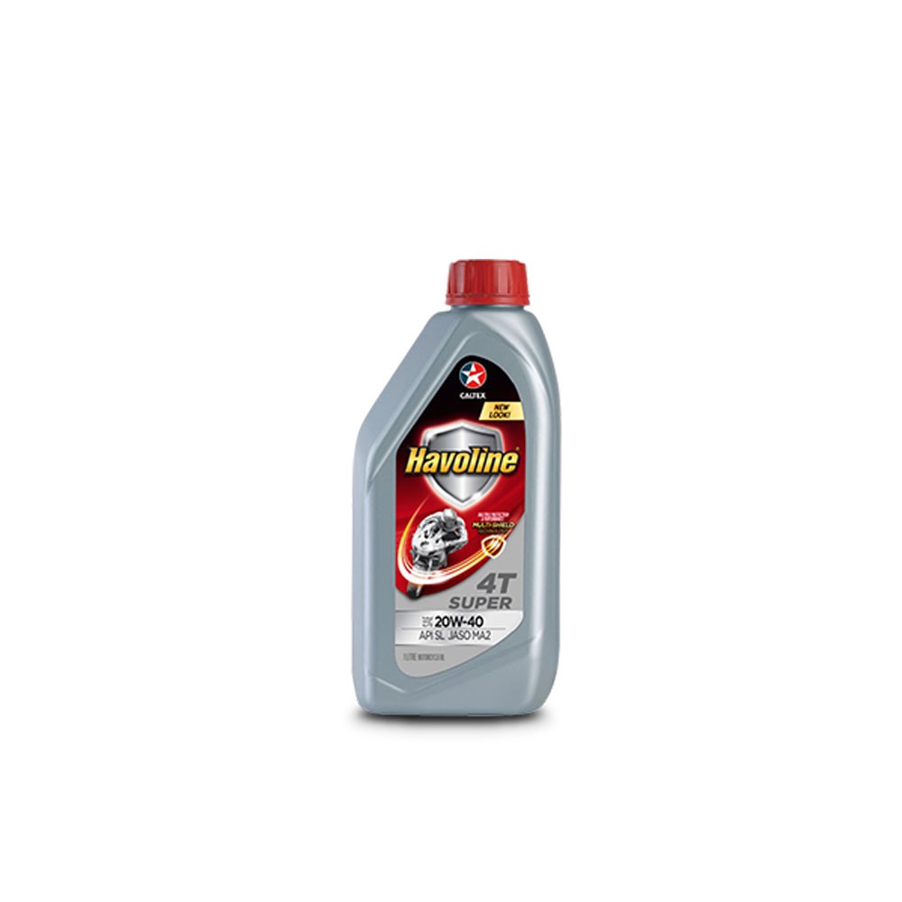 Havoline®Super 4T SAE 20W-40 is a premium performance, shearstable, multigrade, multifunctional fluid specifically designed for use in four-stroke motorcycle engines, clutches and gearboxes, and portable power equipment engines requiring JASO MA2 or MA, API SL lubricants,including high specific outputengines operating in severeservice.